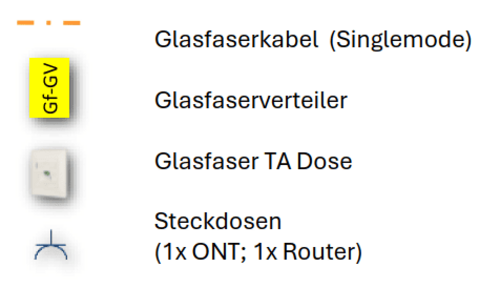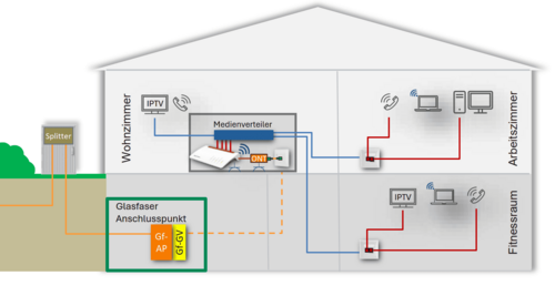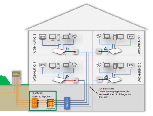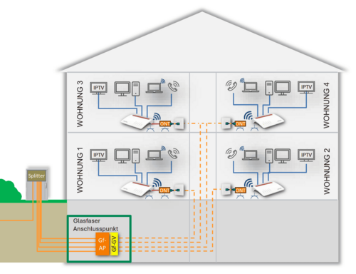 - Vom Gf-AP wird das Signal über einen Gebäudeverteiler (Gf-GV) in die Wohnung geleitet.