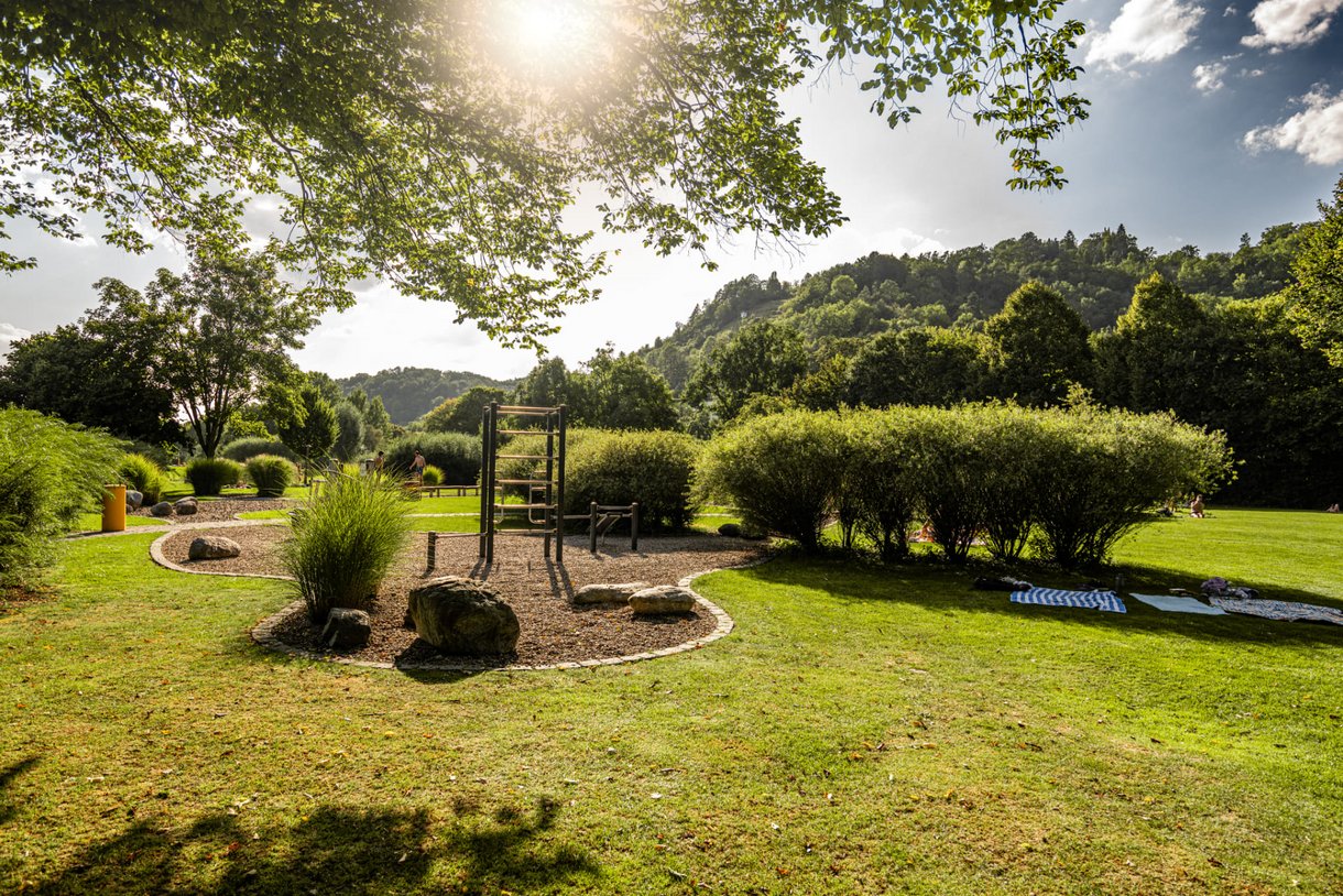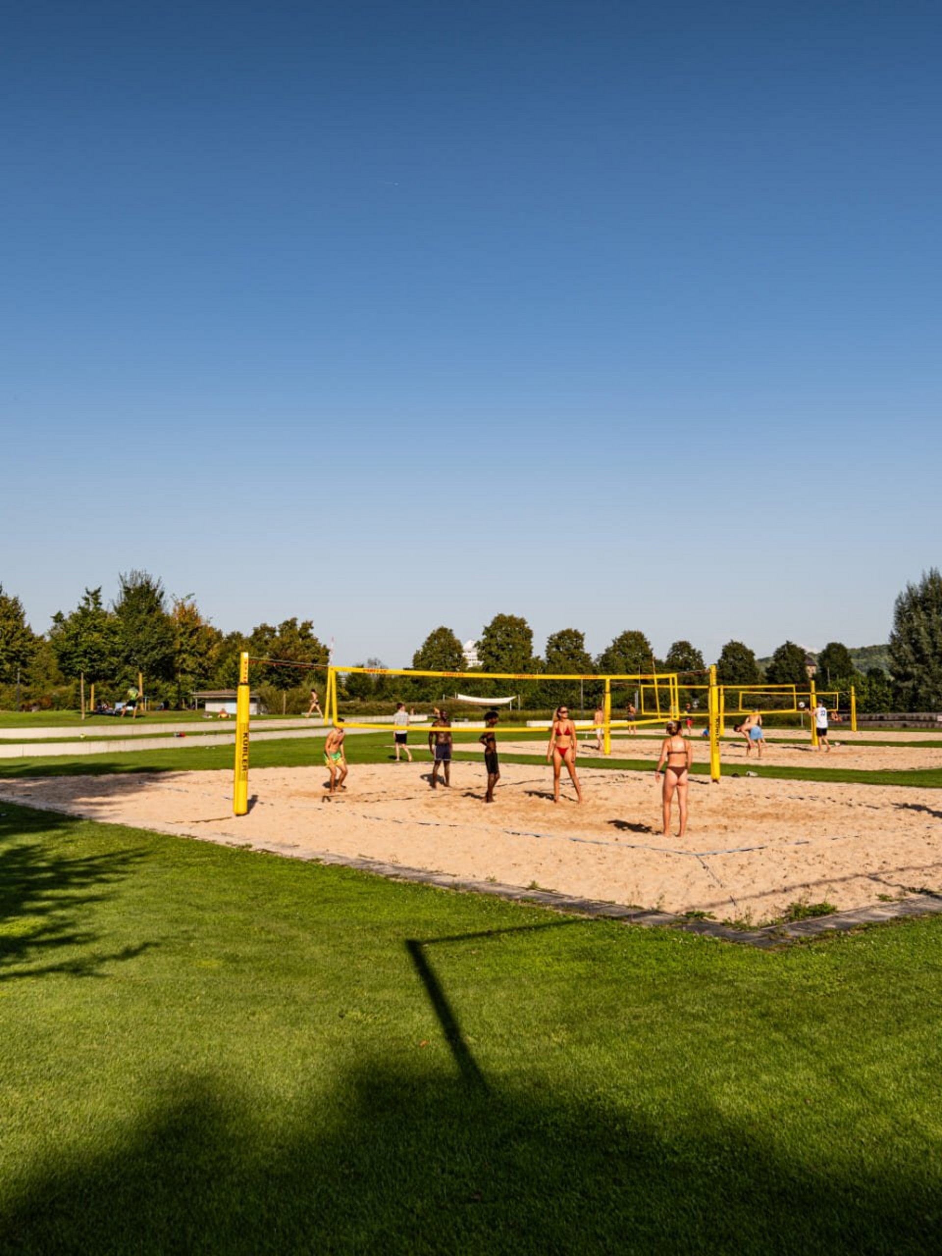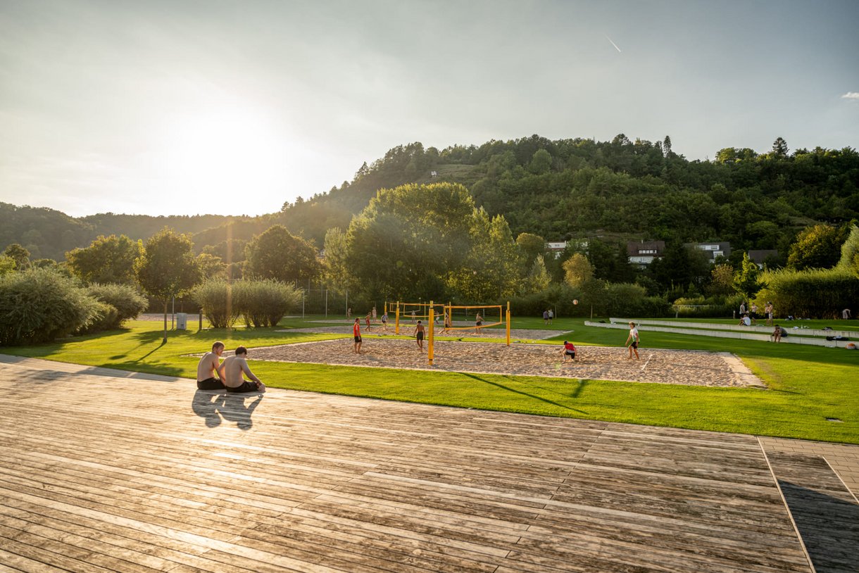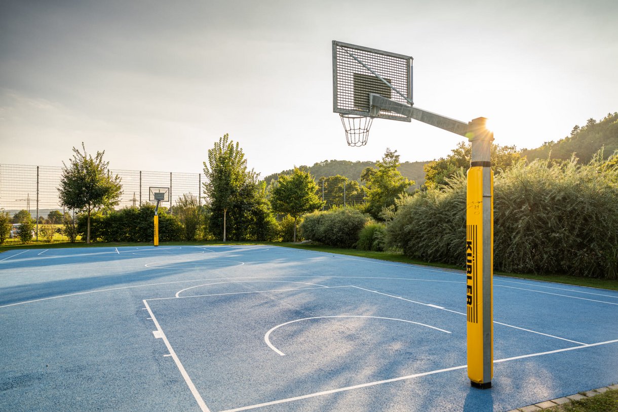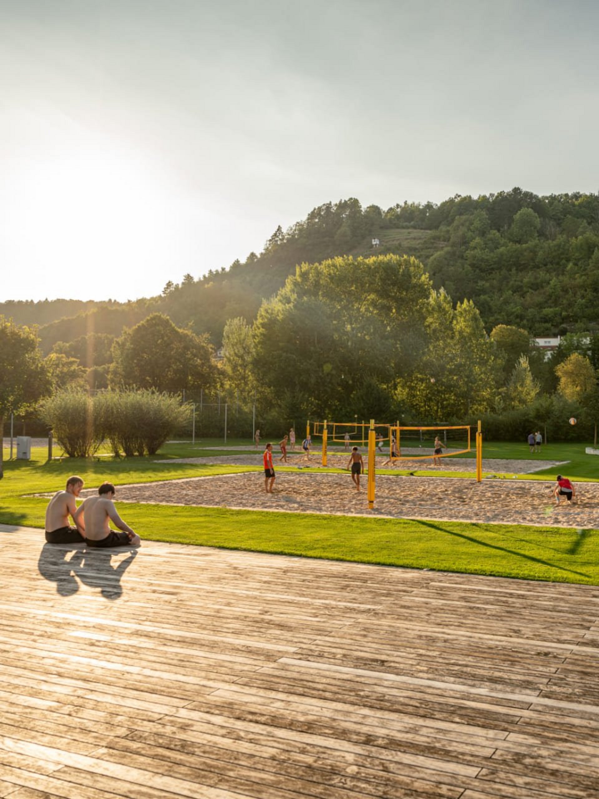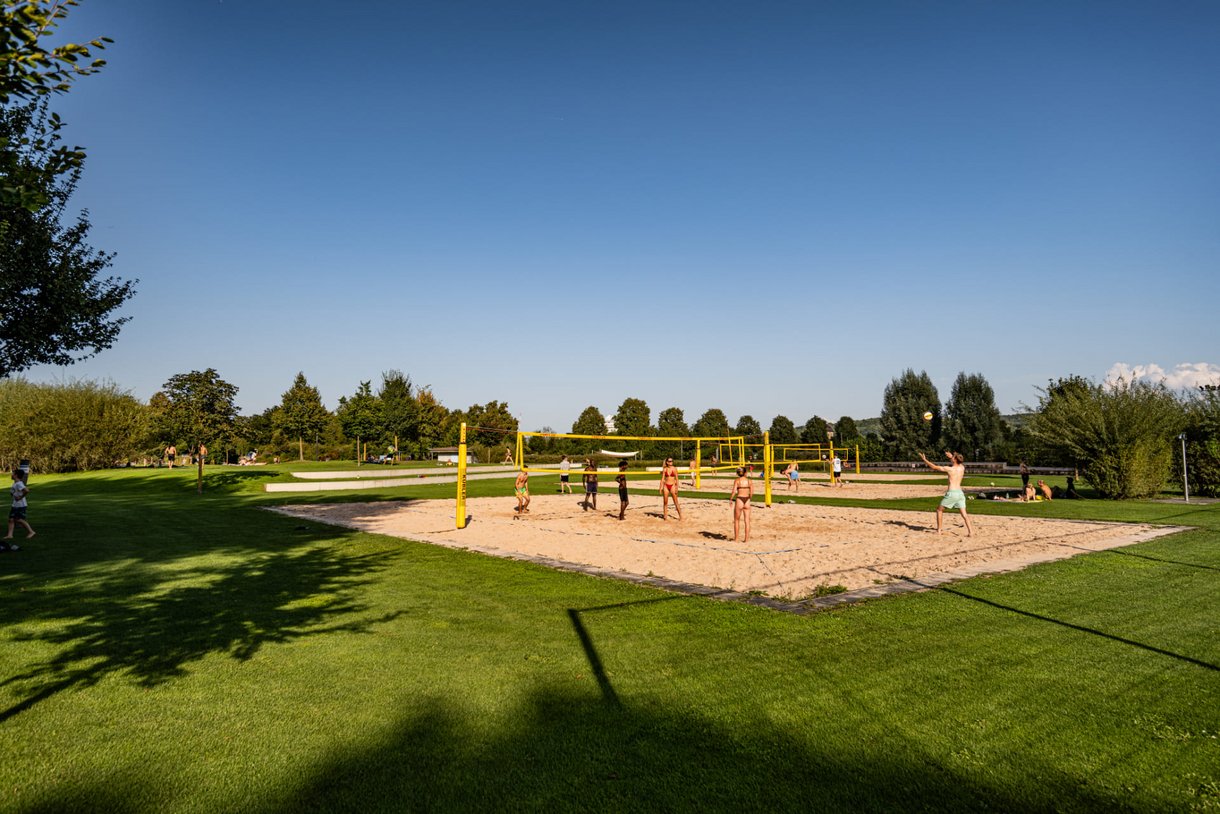 In der Verlängerung zur Liegewiese erwartet Sie ein vielseitiges Angebot zum Sport treiben, Ausruhen und fit bleiben. Neben einem Barfußpfad, Trimm-Dich-Geräten, Tischtennis und -kicker finden Sie eine große Sandinsel mit Sonnensegeln, eingerahmt von einem Holz-Liegedeck. Außerdem bieten drei Beachvolleyball-Felder, ein Beachsoccer-Feld, ein Fußball-Rasenplatz und das Basketball-Feld jede Menge sportliche Abwechslung.