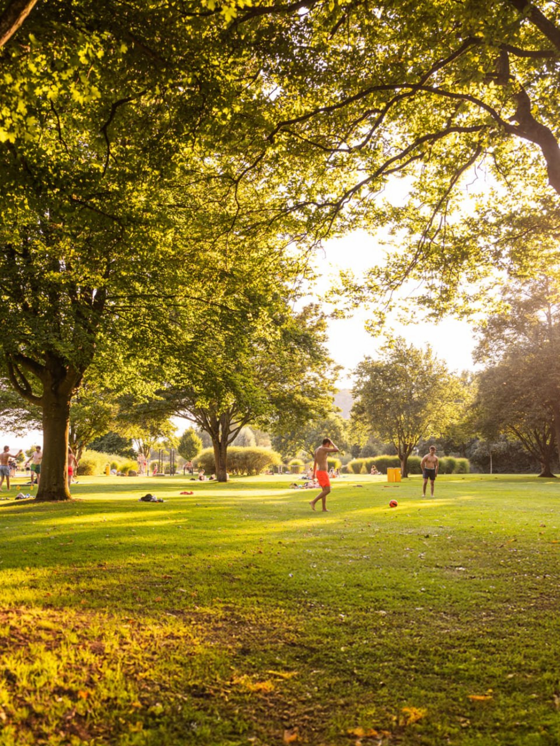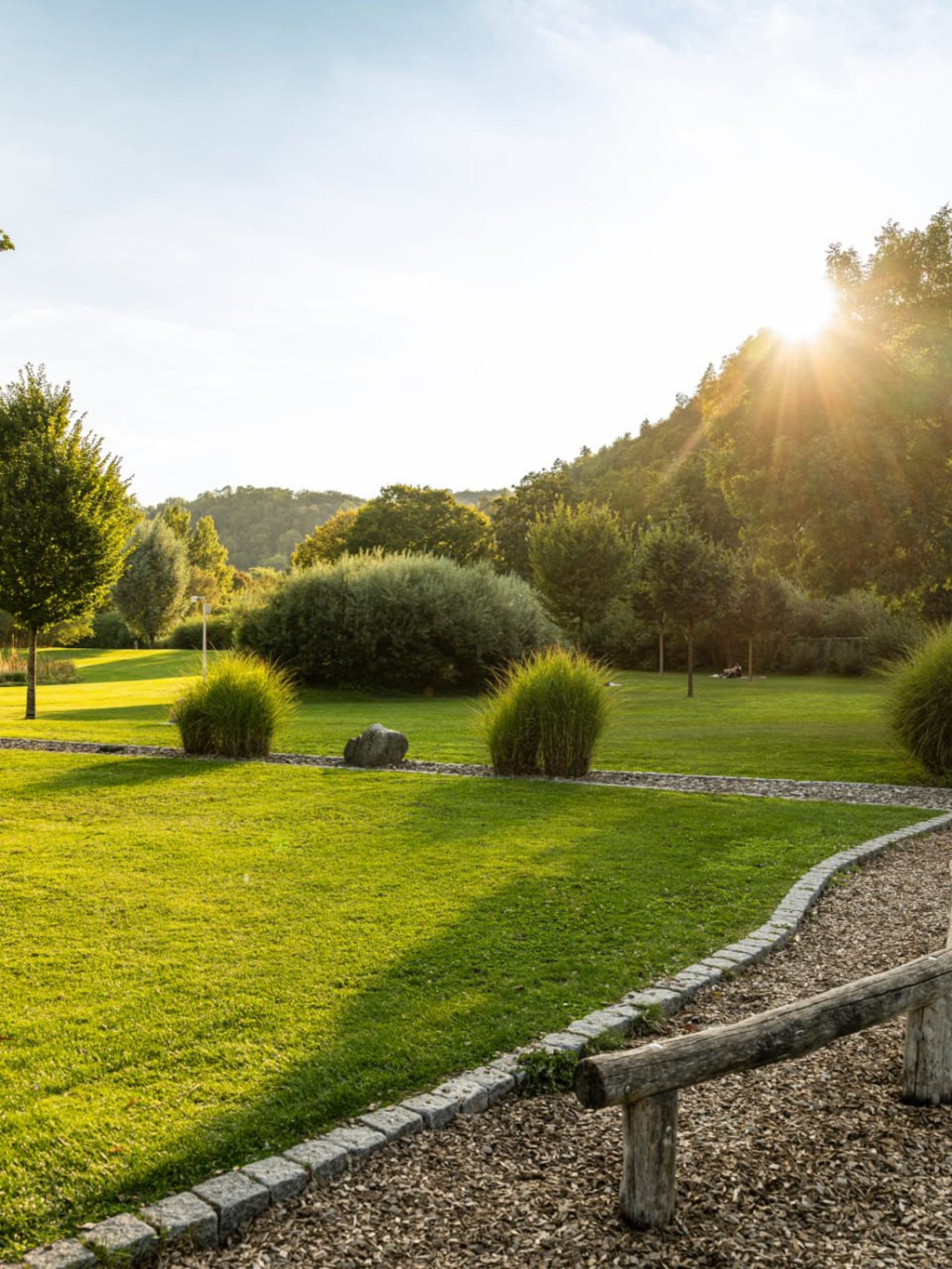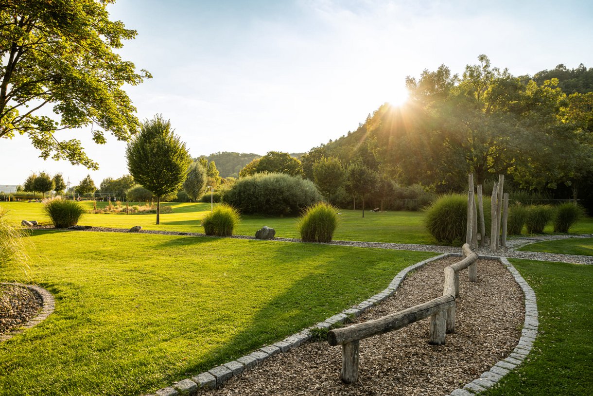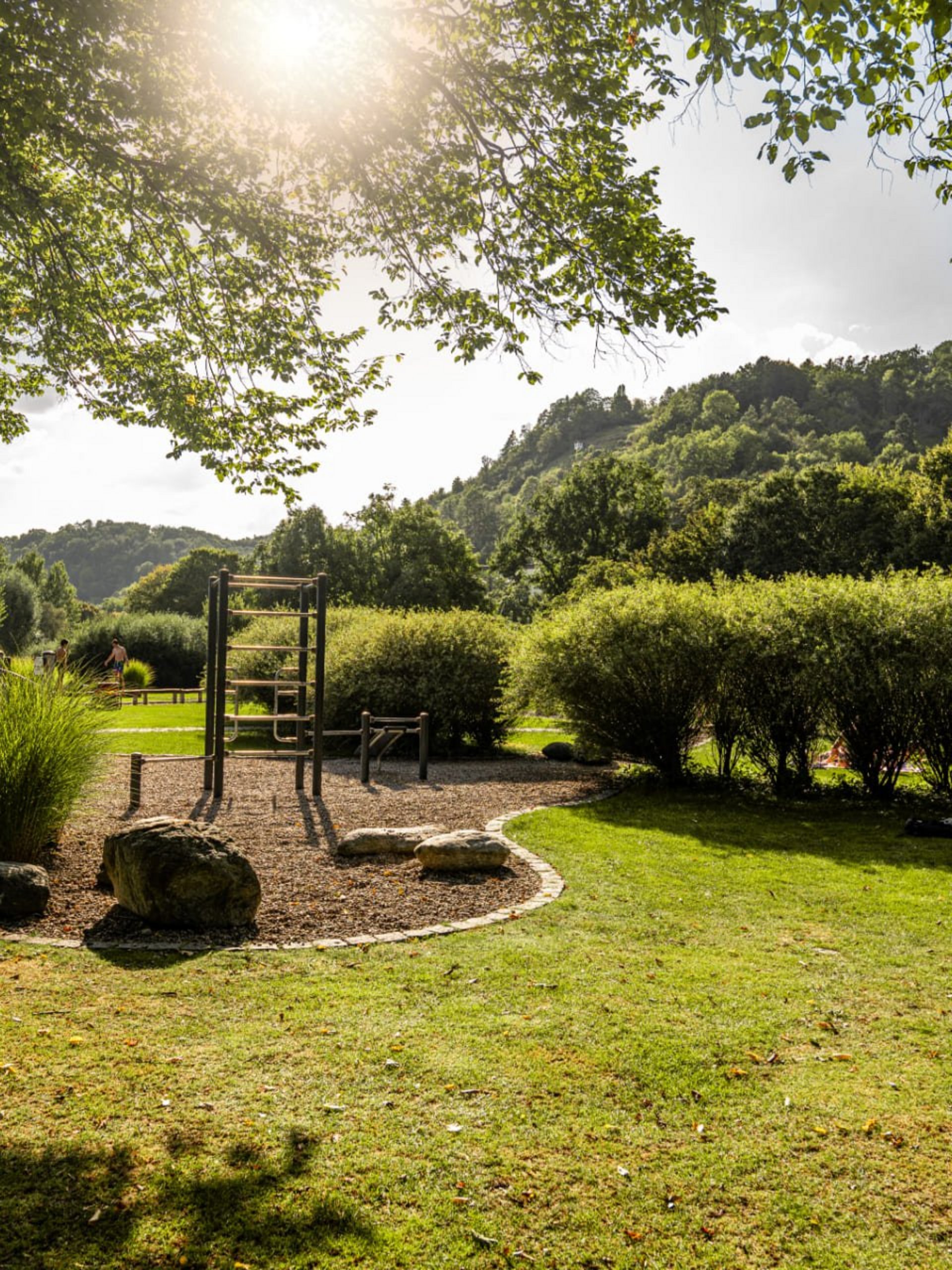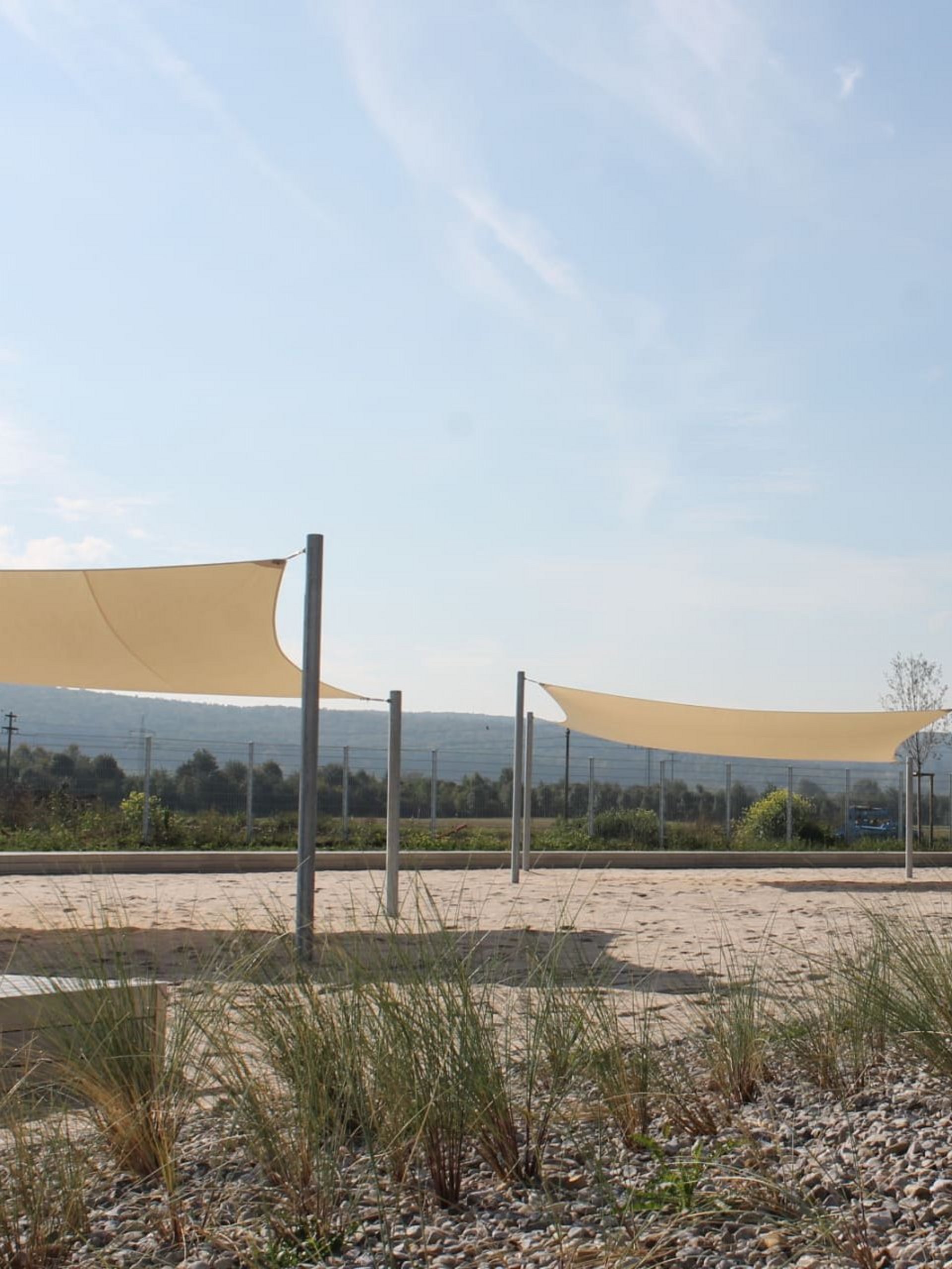 In der Verlängerung zur Liegewiese erwartet Sie ein vielseitiges Angebot zum Sport treiben, Ausruhen und fit bleiben. Neben einem Barfußpfad, Trimm-Dich-Geräten, Tischtennis und -kicker finden Sie eine große Sandinsel mit Sonnensegeln, eingerahmt von einem Holz-Liegedeck. Außerdem bieten drei Beachvolleyball-Felder, ein Beachsoccer-Feld, ein Fußball-Rasenplatz und das Basketball-Feld jede Menge sportliche Abwechslung.