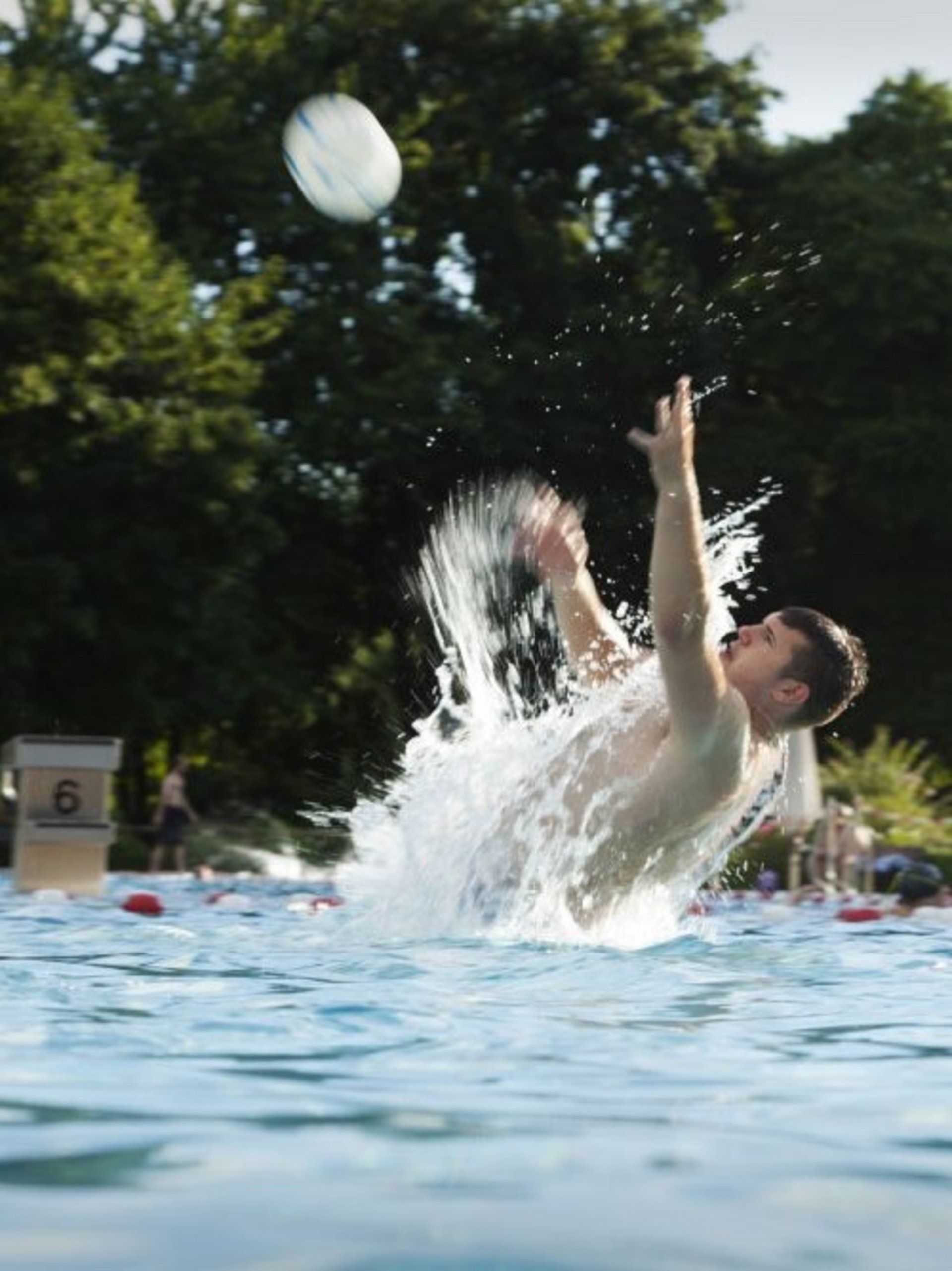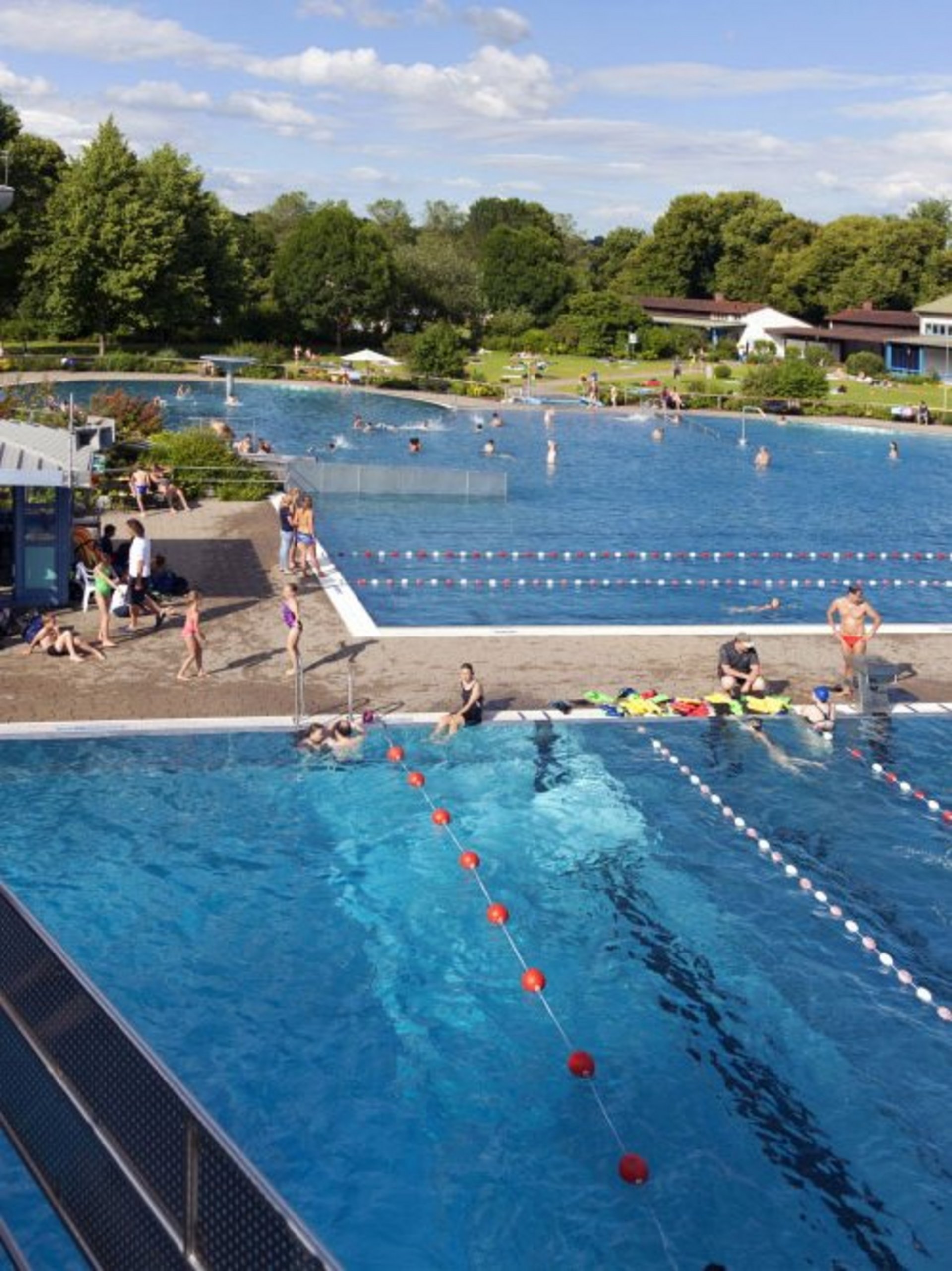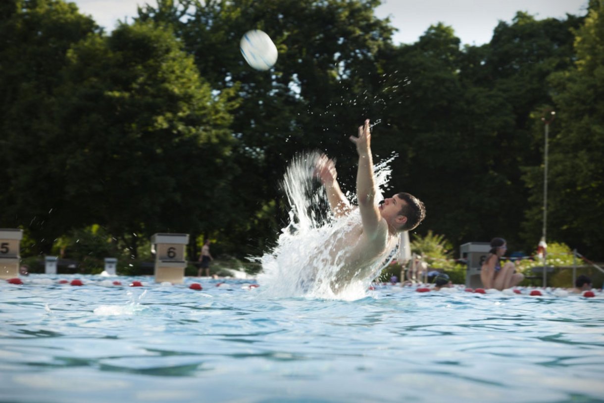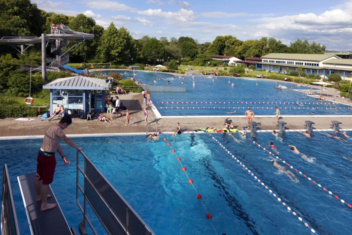 Sportliche Schwimmer dürfen sich über sechs Bahnen im 50-Meter-Becken, ein 1-Meter-Sprungbrett und eine 3-Meter-Sprungplattform sowie einen 5-Meter-Sprungturm freuen. Die Wassertemperatur schwankt je nach Wetterlage.