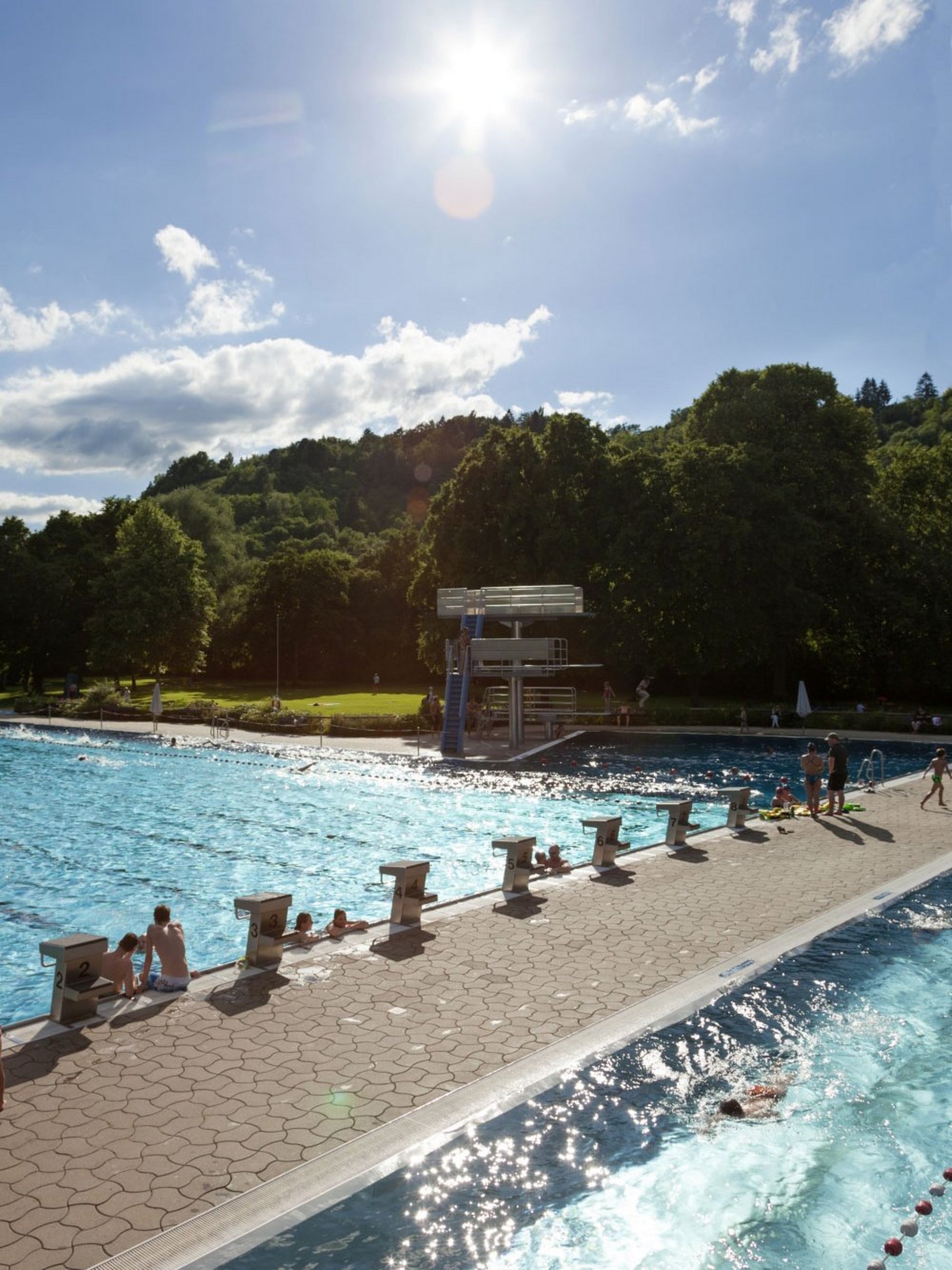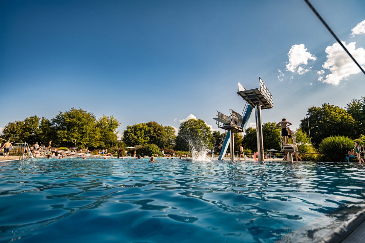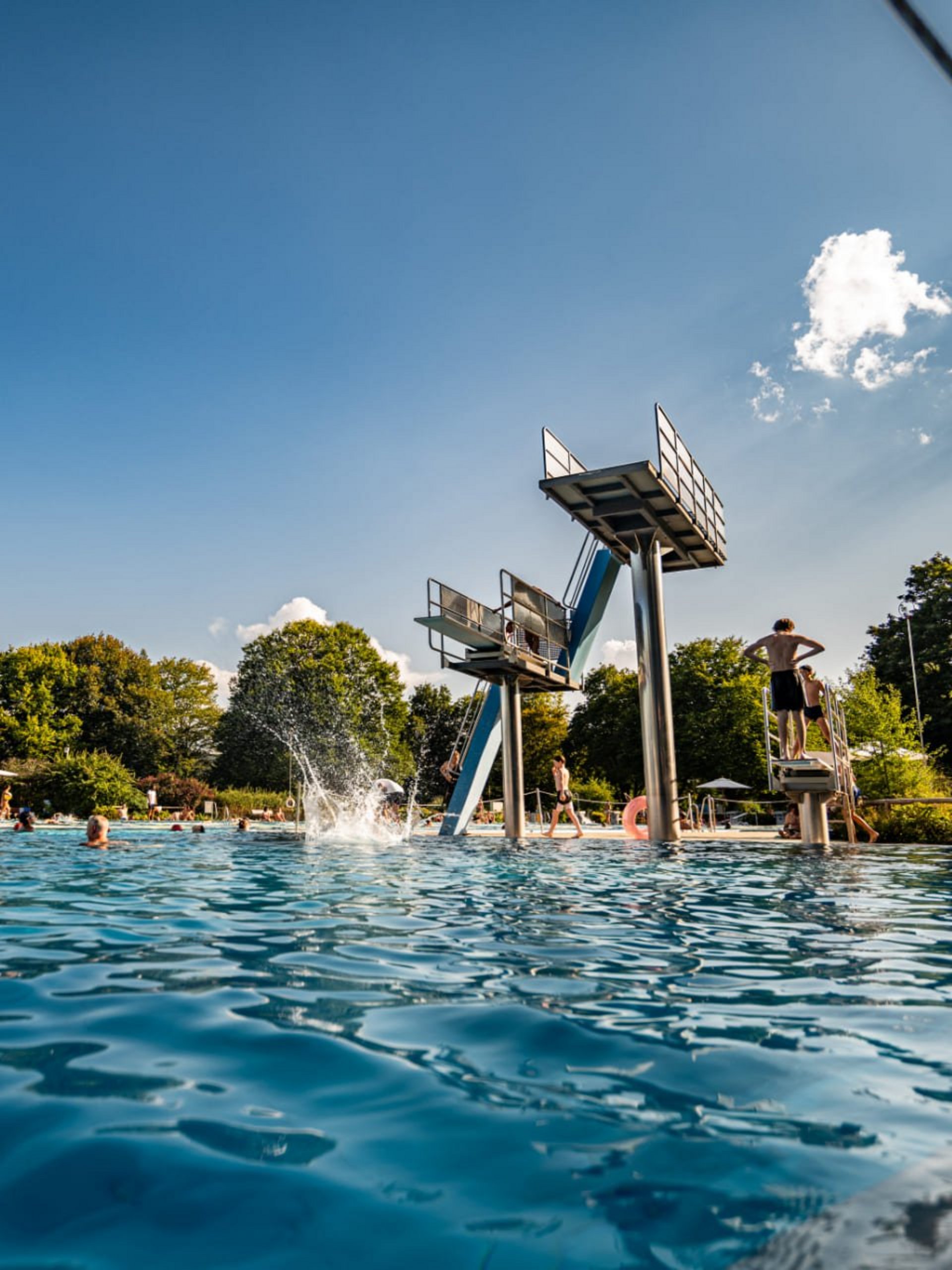 Ein gesonderter Sprungbereich mit 1-Meter- und 3-Meter-Sprungbrett sowie einer 5-Meter-Plattform erlaubt Kopf- und andere Sprünge ins Wasser – ganz ohne Einschränkung.